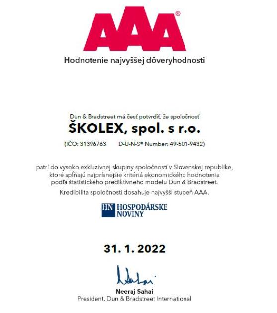 Naše mateřská společnost ŠKOLEX spol. s r.o. získala prestižní ocenění AAA 2022 mezinárodní poradenské a analytické společnosti Bisnode, v zastoupení nadnárodní společnosti Dun & Bradstreet.