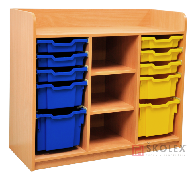 Laminovaná dřevotřísková deska tloušťky 18mm, 2mm ABS hrana. Dvířka a čela zásuvek je možné objednat i v barevných provedeních LDTD, korpus pouze v základních dřevodekorech (buk, dub Sonoma, javor, olše, třešeň), antracitové, černé, šedé a bílé barvě LDTD. Madla jsou kvůli bezpečnosti dětí zapuštěny, barva stříbrná, bez možnosti barevné úpravy. Horní část skříňky je řešena jako prostor pro odkládání hraček a knížek. Jako úložní prostor slouží i plastové symboxy posuvné po plastové kolejnici s pojistkou proti vytažení. Záda skříňky tvoří sololit nebo v případě ustavení do prostoru pohledová LDT deska v barvě korpusu. Při ustavení do prostoru umožňují skříňky optické prodělení místnosti. Za příplatek možnost objednat kolečka ke skříňce.