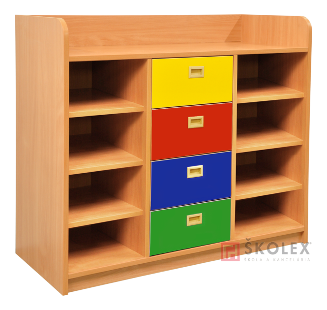 Laminovaná dřevotřísková deska tloušťky 18mm, 2mm ABS hrana. Dvířka a čela zásuvek je možné objednat i v barevných provedeních LDTD, korpus pouze v základních dřevodekorech (buk, dub Sonoma, javor, olše, třešeň), antracitové, černé, šedé a bílé barvě LDTD. Madla jsou kvůli bezpečnosti dětí zapuštěny, barva stříbrná, bez možnosti barevné úpravy. Horní část skříňky je řešena jako prostor pro odkládání hraček a knížek. Záda skříňky tvoří sololit nebo v případě ustavení do prostoru pohledová LDT deska v barvě korpusu. Při ustavení do prostoru umožňují skříňky optické prodělení místnosti. Za příplatek možnost objednat kolečka ke skříňce.