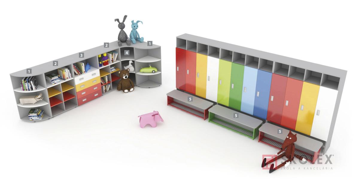 Modelový rad nábytku pre materské školy NELI. Zostava č.1 kombinuje šatňový a hrací priestor, vyznačuje sa farebnosťou a variabilitou v usporiadaní nábytku. Možnosť výberu vlastnej farebnej kombinácie. (více)