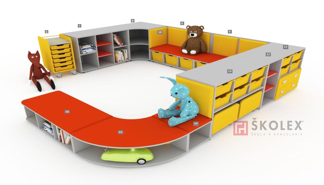 Designová řada nábytku pro mateřské školy NELI. Sestava č.2 je ukázkou vytvoření moderního hracího prostoru pro děti. (více)