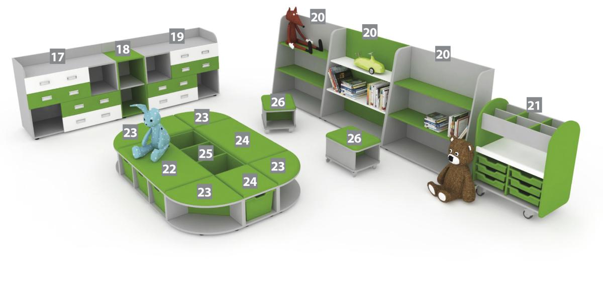 Modelový rad nábytku pre materské školy NELI. Zostava č.3 účelne kombinuje sedací priestor pre deti s úložným priestorom. (více)