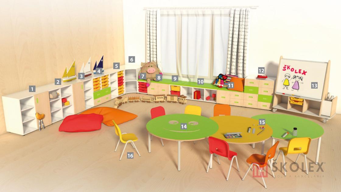 Designová řada nábytku pro mateřské školy NELI. Sestava č. 5. je variabilní, vytváří hrací prostor s mobilními nábytkovými prvky pro malování. Top produktem je mobilní oboustranně popisovatelná tabule na kolečkách s úložním prostorem pro výkresy a výtvarní pomůcky, tak i židličky Tina s plastovou šálou.