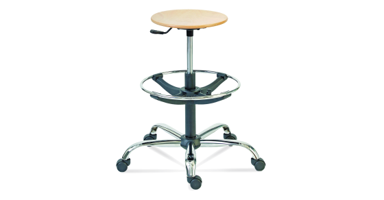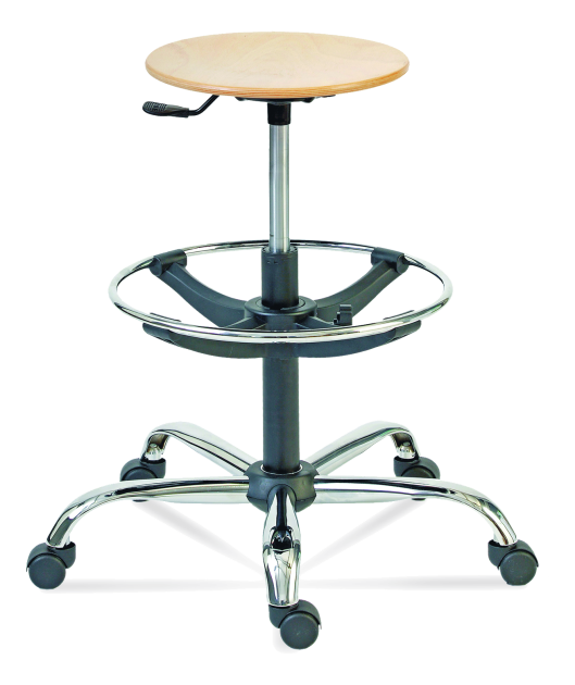 Výškově nastavitelná židle bez opěradla určena do prostor dílen a odborných učeben. Sedák buková překližka, chromová základní báze, kolečka, možnost objednat s výškově nastavitelným extendem (talířem) pro oporu nohou. Nosnost 130kg, záruka 24 měsíců. Výška sedáku bez extendu: 43,5 - 56 cm. Výška sedáku s extendem 59 - 85 cm.