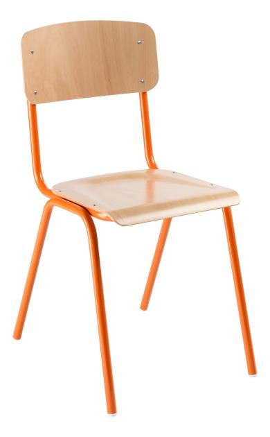 Kovová konstrukce z odlehčeného trubkového profilu Ø 22 mm, lakovaná práškovými barvami (výběr z RAL vzorníku), nohy ukončeny plastovými koncovkami. Sedák a opěrka jsou vyrobené ze 7-vrstvé celobukové tvarované překližky, povrchově upravené kvalitními polyuretanovými laky. Sedáky a opěrky jsou přinýtované ke konstrukci ocelovými nýty průměru 5 mm. Židle jsou stohovatelné, konstrukčně řešené tak, aby se na nich nedalo houpat – prodlužuje se životnost židle. Velikost 3, 4, 5, 6.
