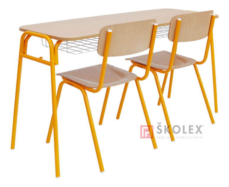 Školní stůl - kovová konstrukce z trubkového profilu Ø 22 mm lakovaná práškovými barvami (výběr z RAL vzorníku), nohy stolu ukončeny plastovými koncovkami, rektifikační šrouby (za příplatek) na ustavení stolu do stabilní polohy. Pracovní deska stolu 130x50 cm, dřevotřísková deska tl. 18mm, 2mm ABS hrana, povrch melammin - buk, přišroubována ke konstrukci 4 metrickými šrouby M6x45mm. Odkládací prostor - hygienický drátěný košík bílé barvy, 2 věšáčky pro pověšení tašek. Stoly jsou stohovatelné. Dostupný ve velikosti č. 3, 4, 5, 6.