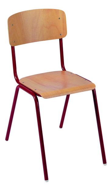 Kovová konstrukce z odlehčeného trubkového profilu Ø 22 mm, lakovaná práškovými barvami (výběr z RAL vzorníku), nohy ukončeny plastovými koncovkami. Sedák a opěrka jsou vyrobené ze 7-vrstvé celobukové tvarované překližky, povrchově upravené kvalitními polyuretanovými laky. Sedáky a opěrky jsou přinýtované ke konstrukci ocelovými nýty průměru 5 mm. Židle jsou stohovatelné, konstrukčně řešené tak, aby se na nich nedalo houpat – prodlužuje se životnost židle. Velikost 3, 4, 5, 6.