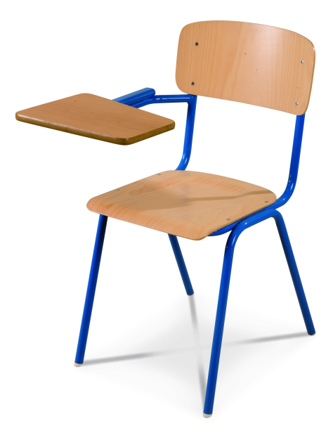 Kovová konstrukce z odlehčeného trubkového profilu Ø 22 mm, lakovaná práškovými barvami (komaxit), výběr z RAL vzorníku. Nohy židle jsou ukončeny plastovými koncovkami. Sedák a opěrka jsou vyrobené z ergonomicky tvarované bukové překližky, povrchově upravené kvalitními polyuretanovými laky. Materiál pultíku - MDF deska. Sedáky a opěrky jsou přinýtované ke konstrukci ocelovými nýty průměru 5 mm. Židle jsou konstrukčně řešeny tak, aby se na nich nedalo houpat. Velikost č. 6, výška sedáku 46 cm.