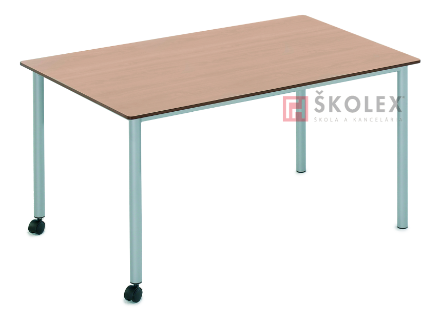 Obdélníkový stůl Pythagoras 72x120x80 cm nebo 72x160x80 cm, laminovaná dřevotřísková deska (výběr ze vzorníku, včetně barevných dezénů) tl.18 mm, 2 mm ABS, kovové podnoží z trubky průměru 40 mm lakované vypalovacími práškovými barvami (výběr z RAL vzorníku), 2 nohy s kolečky pro lehkou manipulaci. Bez úložného prostoru.