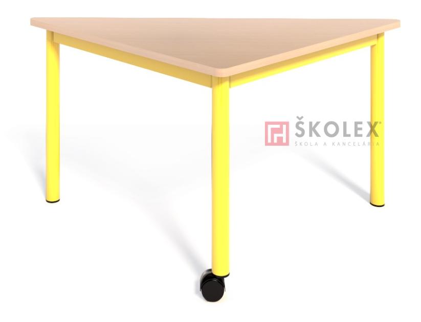 Trojuholníkový stôl Pythagoras 72x80x80 cm, laminovaná drevotriesková doska (výber zo vzorkovníka, vrátne farebných dezénov) hr.18 mm, 2 mm ABS, kovová podnož z rúrky priemeru 40 mm lakovaná vypaľovacími práškovými farbami (výber z RAL vzorkovníka), 1 noha s kolieskom pre ľahkú manipuláciu. Bez úložného priestoru.