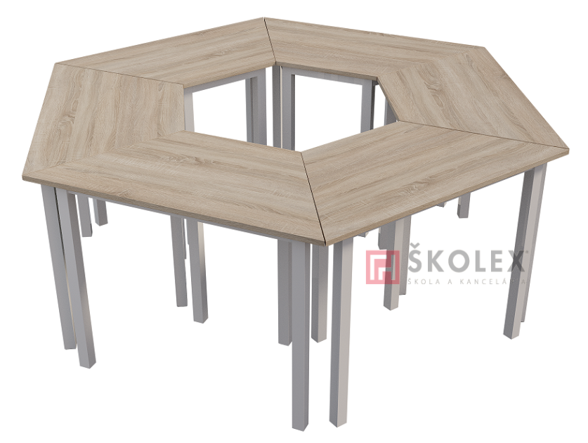 Moderní stůl lichoběžníkového formátu 100x50mm výškově pevný, podnož z jeklového profilu, povrchově upravena vypalovací práškovou barvou (výběr z RAL vzorníku), laminovaná dřevotřísková deska tl. 18mm, různých dezénů (výběr ze vzorníku "Barva desky"). Dostupný ve velkostech 3, 4, 5, 6. Vhodný pro skupinové řešení úloh anebo uspořádání stolů do "hnízd". Záruka 2 roky.