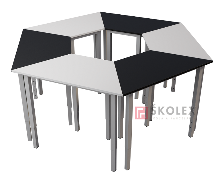 Moderní výškově nastavitelný stůl lichoběžníkového formátu 100x50mm, podnož z jeklového profilu, povrchově upravena vypalovací práškovou barvou (výběr z RAL vzorníku), laminovaná dřevotřísková deska tl. 18mm, různých dezénů (výběr ze vzorníku "Barva desky"). Výškové nastavení: 580mm - 820mm (vel. 3 - 7). Vhodný pro skupinové řešení úloh anebo uspořádání stolů do "hnízd". Záruka 2 roky.