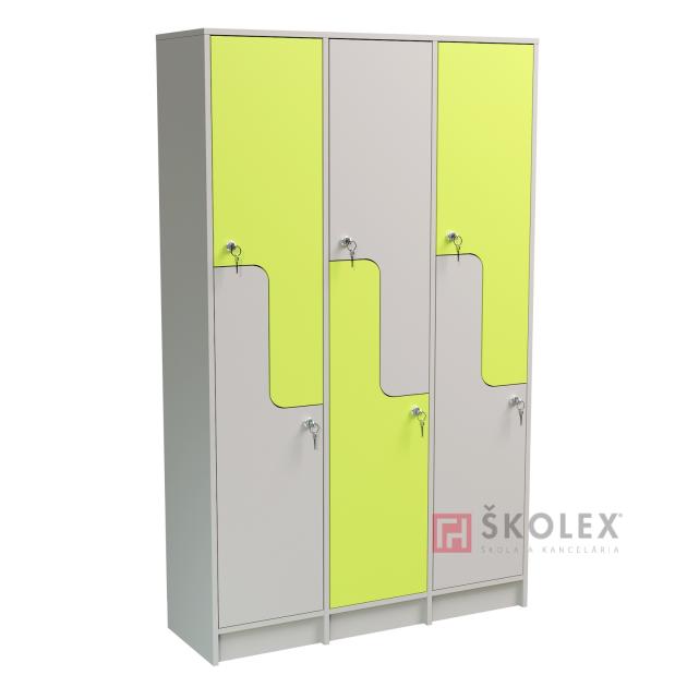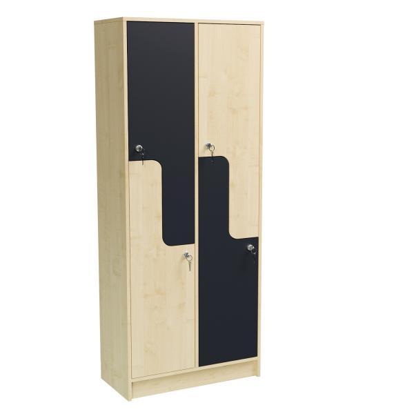 Skříně z laminované dřevotřískové desky tl.18mm s 2mm ABS hranou na exponovaných částech, možnost volby dekoru LDTD (korpus skříňky/vzorník "Barva korpusu", dvířka/vzorník "Barva dvířek"). Prakticky a účelně členěný prostor, který umožňuje v jedné skříni uskladnit věci dvou žáků. Uvnitř skříňky je tyč pro pověšení oděvů. Uzamykání na cylindrický klíč. Za příplatek možnost objednat okapávací vaničku na boty.