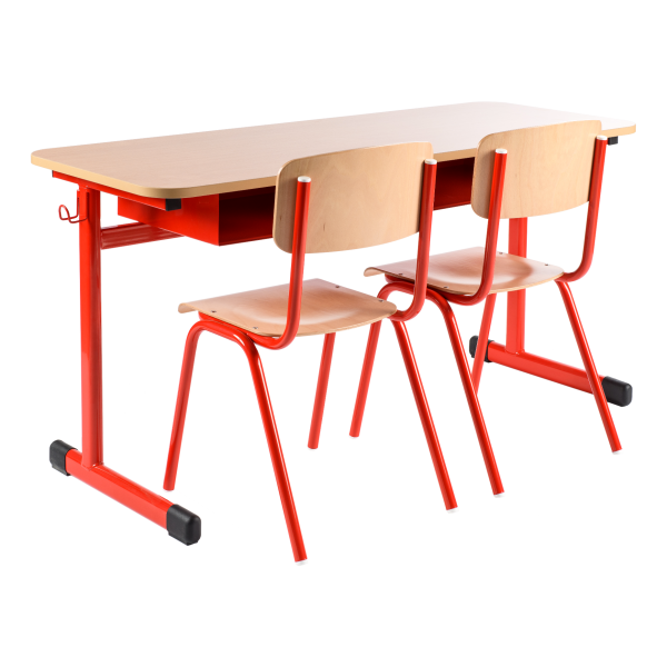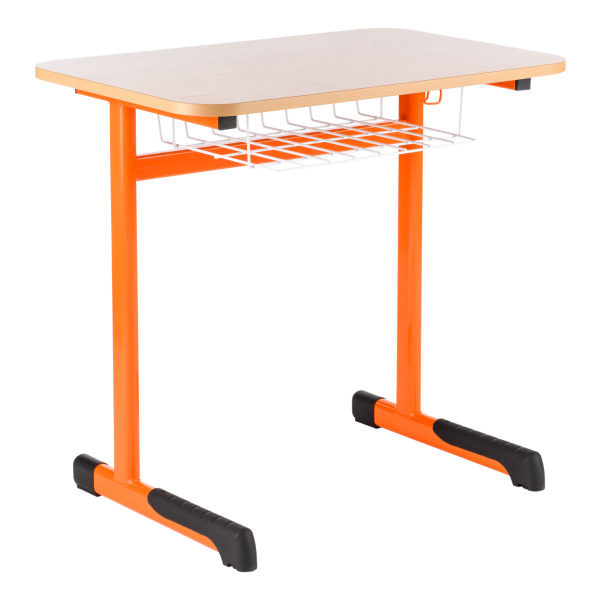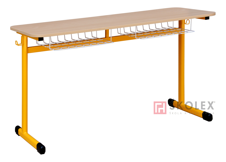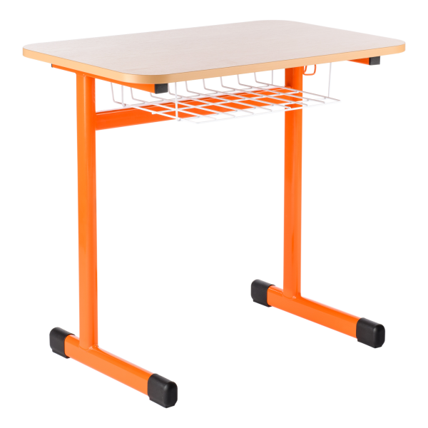 Kovová konstrukce stolu vysoké pevnosti vyrobená z plochooválného profilu 50 x 30 mm, lakovaná práškovými barvami různých odstínů, nohy jsou ukončeny plastovými koncovkami s velkou trecí plochou, které tlumí hluk a nepoškozují podlahu. Pracovná deska stolu 130 x 50 cm je z dřevotřísky tl. 18 mm, povrch melamin - buk, (zaoblené hrany desky R 70 mm) přišroubovaná ke konstrukci 4 metrickými šrouby M6 (prostřednictvím zalisovaných ocelových pouzder); hrany desky stola jsou chráněny 2 mm ABS hranou. Odkládací prostor stolu je řešen hygienickým drátěným košíkem (neusazuje se prach), lakovaný komaxitovou barvou, 2 věšáčky na zavěsení tašek. Ke školním stolům TITAN jsou vhodné školní židle LAVA,SOKRATES, školní katedra LUX nebo UNO a učitelské židle SOKRATES čalouněné.